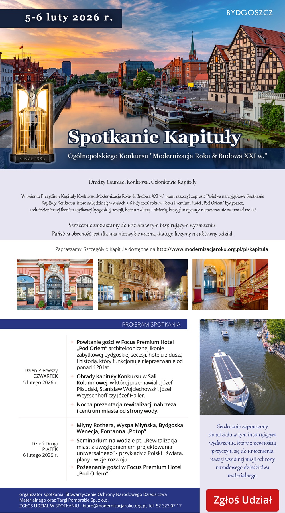 Dla członków szacownego grona organizowane jest, zgodnie z kilkunastoletnią tradycją Konkursu „Modernizacja Roku & Budowa XXI w."” coroczne Spotkanie jego Kapituły. Na Spotkaniu tym zapadają ważne dla Konkursu i polskiego budownictwa decyzje, poruszane są tematy dotyczące realizacji remontowych, modernizacyjnych i konserwatorskich. To Państwo - Członkowie Kapituły - przez swoją obecność, dyskusje, spostrzeżenia, wymianę poglądów na Spotkaniu kreują najlepsze wzorce w dziedzinie budownictwa. Obradom Kapituły towarzyszą seminaria oraz obrady Stowarzyszenia Ochrony Narodowego Dziedzictwa Materialnego.