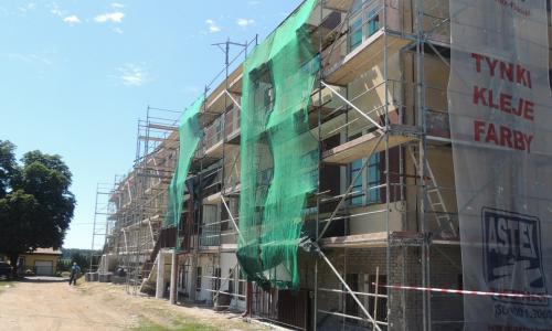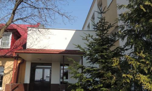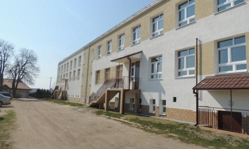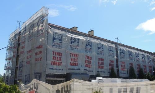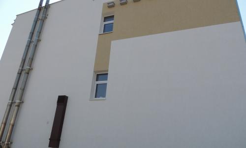 1) Wykonano ocieplenie ścian zewnętrznych za pomocą metody „lekkiej-mokrej” w jednorodnym systemie (1225 m2). Jako materiał izolujący zastosowano styropian przyklejony do ścian zewnętrznych i zabezpieczony cienkowarstwowym tynkiem mineralnym (cokół płytkami klinkierowymi).