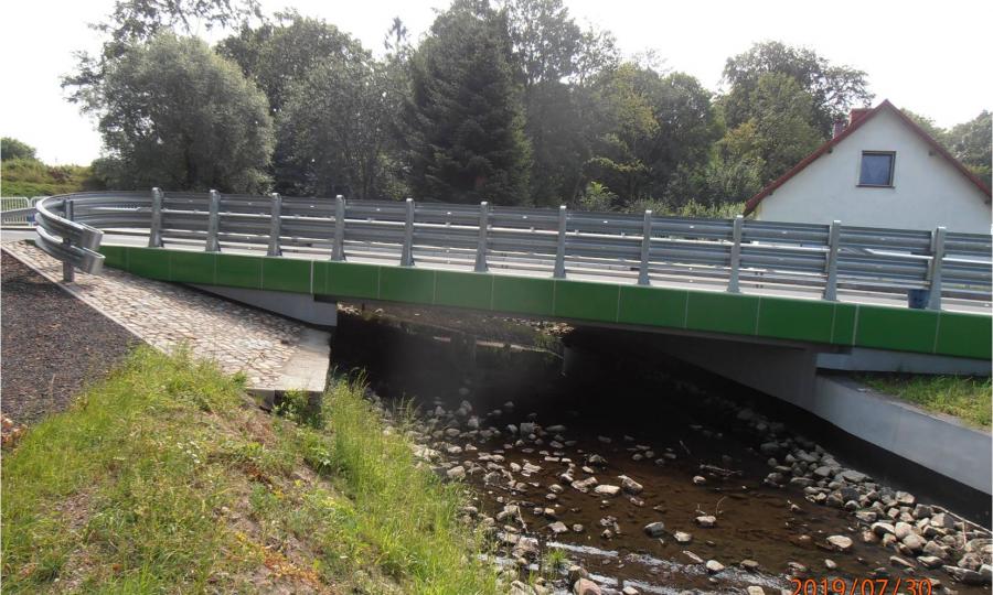 Obiekt posiada żelbetowe przyczółki. Ustrój niosący wykonano z belek strunobetonowych DS 9 zespolonych z płytą żelbetową. Wykonano umocnienie dna rzeki wraz z skarpami i półkami dla płazów i drobnej zwierzyny za pomocą okładziny kamiennej na podłożu betonowym oraz umocnienie koryta rzeki poprzez utworzenie muru oporowego z koszy gabionowych. Skarpy natomiast wraz ze stożkami nasypu drogowego na dojazdach do mostu umocniono okładziną kamienną. Wzdłuż gzymsów mostu zlokalizowano barieroporęcze H2W2B z wypełnieniem w postaci systemowej balustrady o wysokości 1,10 m. Nawierzchnia z elastycznych żywic epoksydowo – poliuretanowych została wykonana na żelbetowych kapach chodnikowych, natomiast nawierzchnia jezdni z betonu asfaltowego ułożona została na termozgrzewalnej papie i warstwie wiążącej z asfaltu lanego. Wykonano również z nawierzchnię jezdni z betonu asfaltowego na dojazdach do mostu.