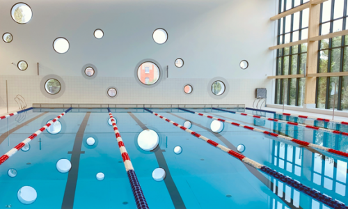 Pływalnia przy ul. Bażyńskich to nowoczesny trzykondygnacyjny obiekt sportowo-rekreacyjny. Znajduje się w nim główny basen o wymiarach 25 m x 15,4 m, o głębokości 1,35-3,6 m oraz baseny w części rekreacyjnej. Pierwszy o wymiarach 12 x 6 m z ruchomym dnem, przeznaczony jest do nauki pływania, aqua areobiku, aquabike’u i nurkowania. W drugim, rekreacyjnym o nieregularnym kształcie znajdują się takie atrakcje, jak: bicze wodne, rwąca rzeka, gejzery i ławki z hydromasażem. Jest także brodzik dla najmłodszych. Szczególnymi atrakcjami są dwie zjeżdżalnie: 62- i 90-metrową, obie o różnicy poziomów 9,6 m, a także basen zewnętrzny o lustrze wody 16 m kw.