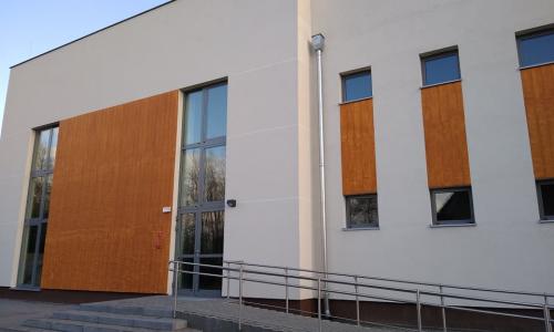 Wejście główne znajduje się w łączniku z budynkiem Szkoły Podstawowej, pozostałe niezależne wejścia do budynku, wejścia ewakuacyjne, znajdują się od strony północnej i od strony południowo-zachodniej. W ramach inwestycji stworzono parking na 3 miejsca postojowe dla samochodów osobowych, utwardzony kostką betonową. Nowe ogrodzenie prowadzone zostało zgodnie z rysunkiem zagospodarowania terenu, a przed wejściem do obiektu zamontowano stojak na rowery.