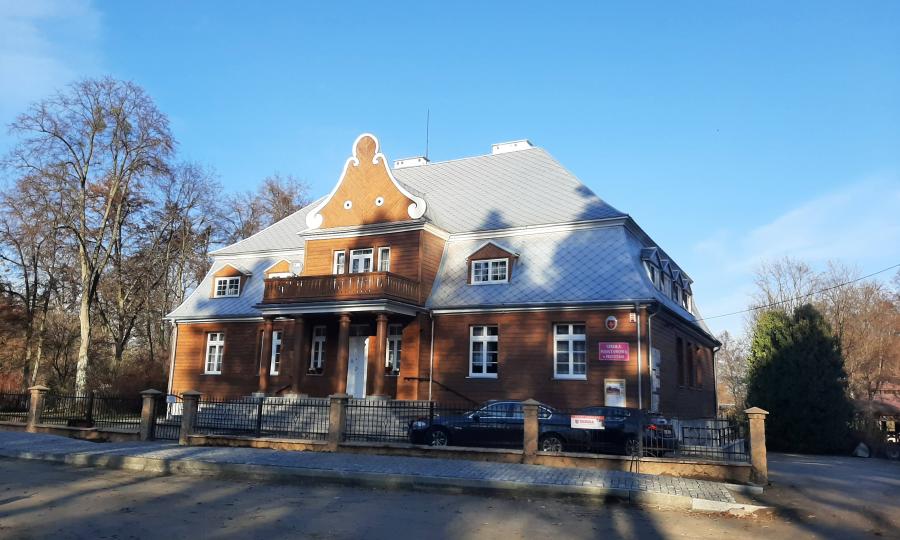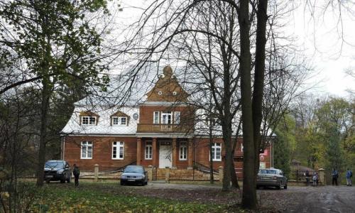 ryzalitami od strony północnej. Od strony północnej posiada betonowy taras ze schodami pozwalającymi na zejście do ogrodu. Posiada jedną kondygnację i poddasze. Został wykonany z drewna sosnowego. Architektura budynku nawiązuje do okresu późnobarokowego.