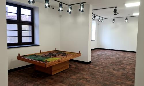hol główny (łączący z częścią istniejącą budynku, salą konferencyjną oraz wyjściem na taras. Pomieszczenie musi umożliwiać rozmieszczenie części ekspozycji czasowej),