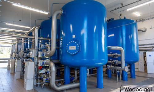 Woda po filtrach ciśnieniowych (w sumie 8 filtrów, zblokowanych po 4 w dwóch stopniach) kierowana jest na zbiorniki retencyjne, skąd trafia do sieci po dezynfekcji z wykorzystaniem lamp UV.