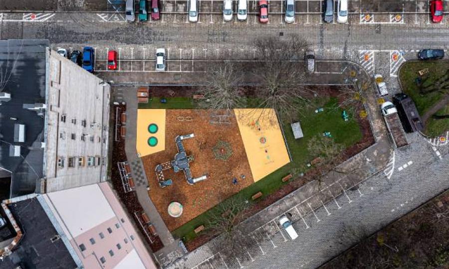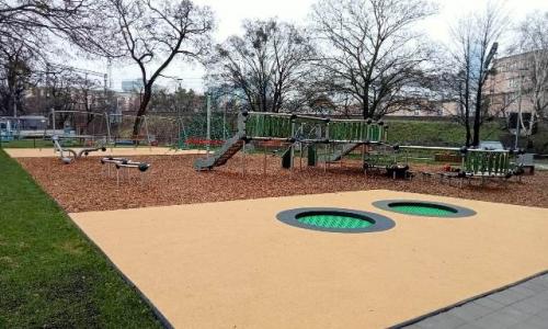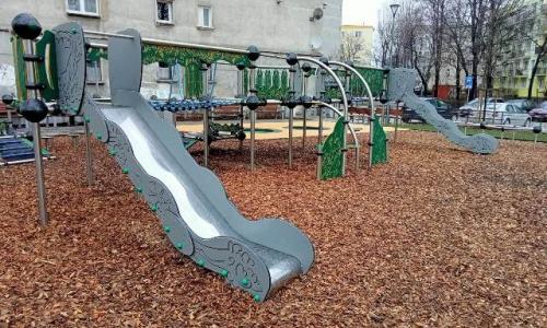 Pamiętający lata 60. ubiegłego stulecia, wyeksploatowany plac zabaw zamieniliśmy w wymarzone miejsce do zabaw i rekreacji wyposażony w nowoczesne urządzenia i małą architekturę. Do dyspozycji dzieci pozostają teraz: wielofunkcyjny tor przeszkód ze zjeżdżalniami, drabinkami i równoważniami. Na pięknym ocienionym starymi drzewami skwerze mamy też różnego typu huśtawki, bujaki i trampoliny. A wisienką na torcie jest wielka piramida linowa do wspinaczki dla dzieciaków w każdym wieku. Nie mogło zabraknąć piaskownicy, która - uwaga! - ma specjalną skrzynię do pozostawienia zabawek lub chowania skarbów.