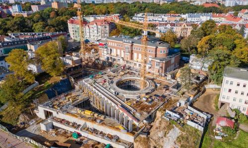 z wykonaniem murków prowadzących, zbrojenie i betonowanie. Zakończono roboty rozbiórkowe w budynku Zabytkowym i obiektów kubaturowych w terenie zewnętrznym.