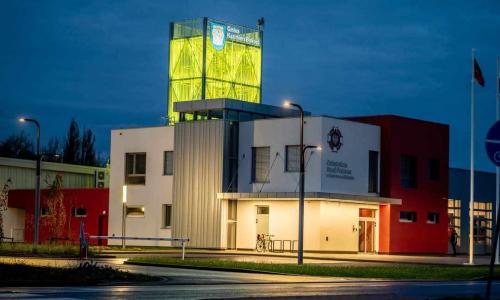 Kolorystyka i rozwiązania materiałowe zastosowane w nowej remizie nawiązują i kojarzą się z wozem pożarniczym, Użyto identyczny odcień czerwieni jaki używany jest na wozach strażackich. Do tego dochodzi biel i aluminium stosowane w wozie bojowym.