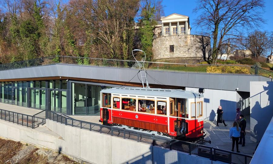 Na placu dolnym w okolicach wejścia głównego przewidziano umiejscowienie repliki tramwaju z początku XX wieku. Tramwaj jest ustawiony równolegle do jednej z fasad budynku i stanowi on atrakcję turystyczną dla zwiedzających.