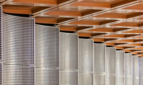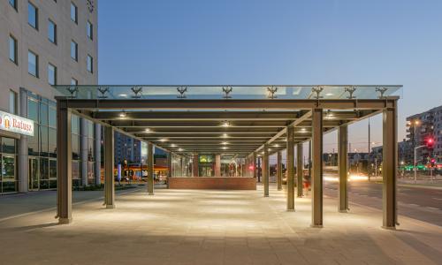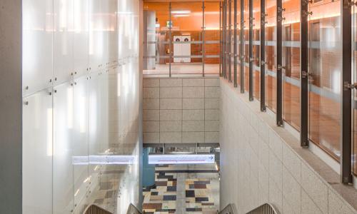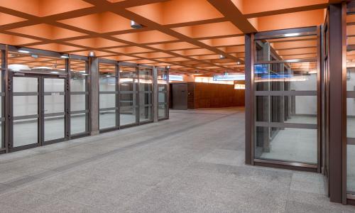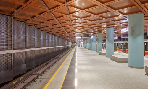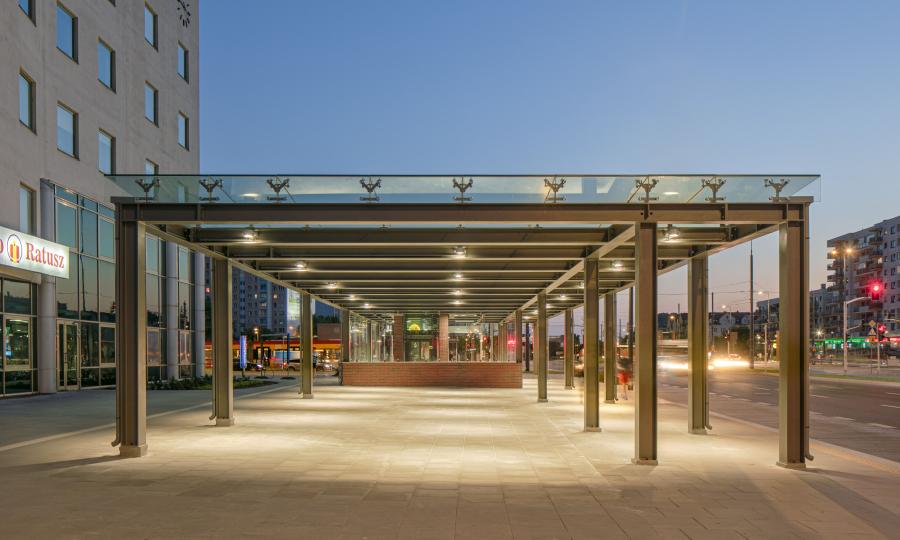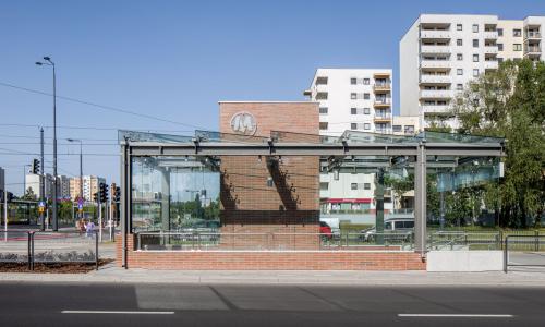 odstawczych po zachodniej stronie tego skrzyżowania, przejść podziemnych połączonych z korpusem stacji, otaczających skrzyżowanie od wszystkich stron z wyjściami dedykowanymi z metra na przystanki tramwajowe (poziom -1), a także obiektów naziemnych: wejść/wyjść do metra oraz elementów infrastrukturalnych, w tym czerpnio-wyrzutni powietrza. Podstawowe wyjścia ze stacji uzupełnione są o wspomniany metropolitalny multimodalny układ przejść podziemnych pod skrzyżowaniem ul. Powstańców Śląskich i ul. Górczewskiej. Zaprojektowano p o 2 wejścia d o stacji w głowicy wschodniej i zachodniej, zlokalizowane po obu stronach ul. Górczewskiej (poziom -1) i rozbudowane o zespół przejść podziemnych pod skrzyżowaniem (poziom -1), które umożliwiają bezkolizyjne przejście we wszystkich kierunkach oraz na wyspowe przystanki tramwajowe. W każdej z głowic stacji zaprojektowany został megalampion strukturalny łączący parę schodów ruchomych oraz schody stałe. Ściany zatorowe ukształtowano jako perforowane przerdzewione powtarzalne rytmicznie sekwencje paneli stalowych o powtarzalnym reliefie. Ustrój akustyczny w formie kasetonów zamontowanych w układzie skośnym w stosunku do ścian zatorowych rozpostarty jest nad halą peronową wraz ze zintegrowanymi w nim elementami oświetlenia. Zastosowano naturalne materiały architektoniczne o długim okresie trwałości: posadzki kamienne i lastrykowe, wielobarwne mozaiki w okolicach schodów, stal werniksowaną, szkło białe odżelazione, panele stalowe wypełnione ceramiką, tynk akustyczny. Obiekty naziemne zaprojektowano w konstrukcji stalowej szkieletowej z przeszkleniami szedowymi, w rytmie industrialnym. Wykonano szczegółową pracę studialną układów chromatyczno- materiałowych i światła w obszarze całej stacji, jej części podziemnej i nadziemnej. Stacja metra dostosowana jest dla osób z ograniczoną zdolnością poruszania się i innymi niepełnosprawnościami.