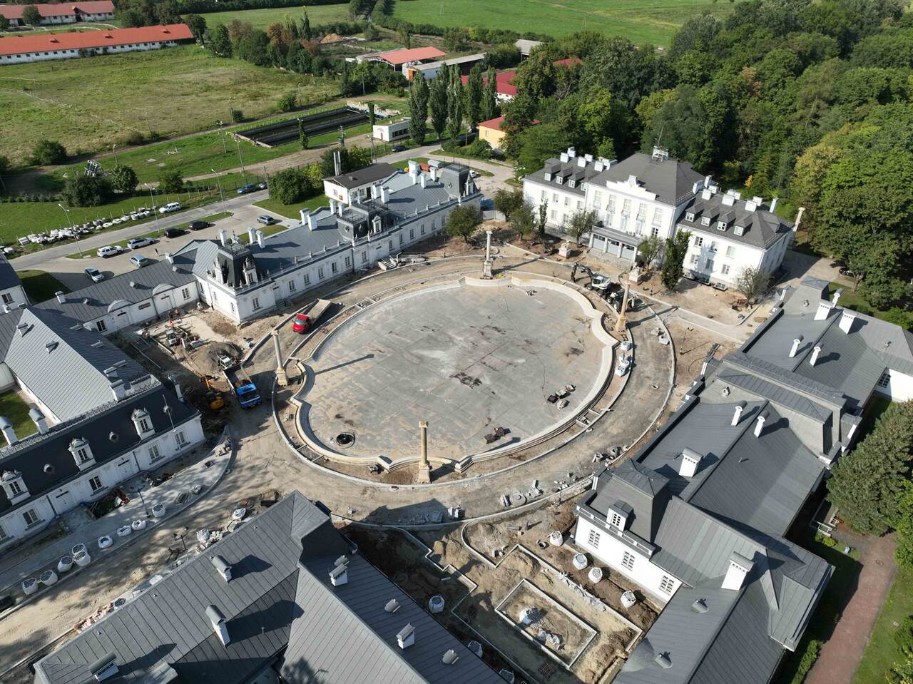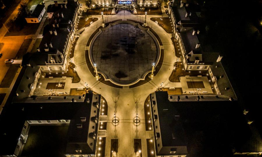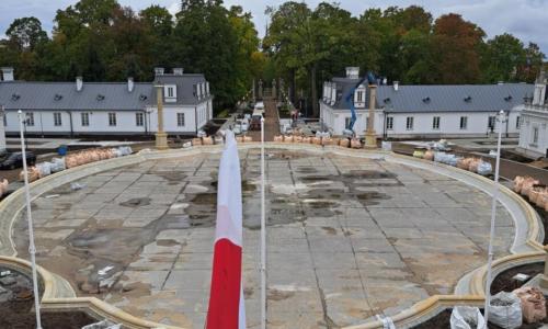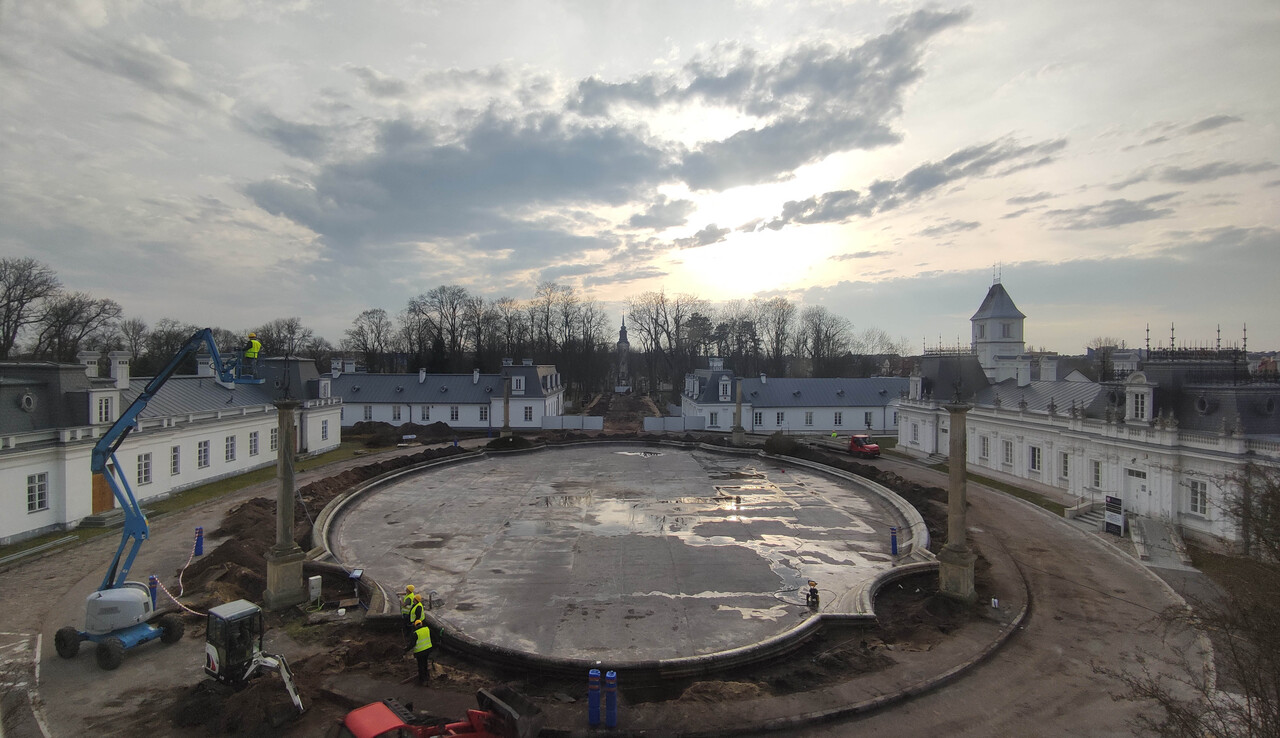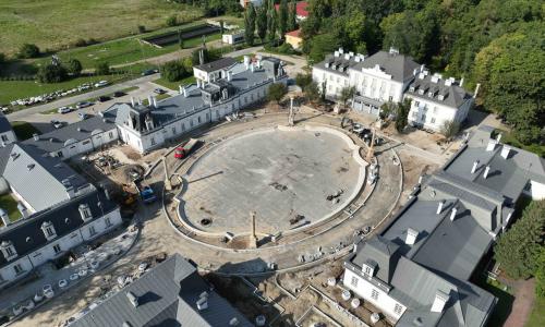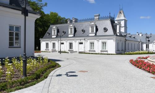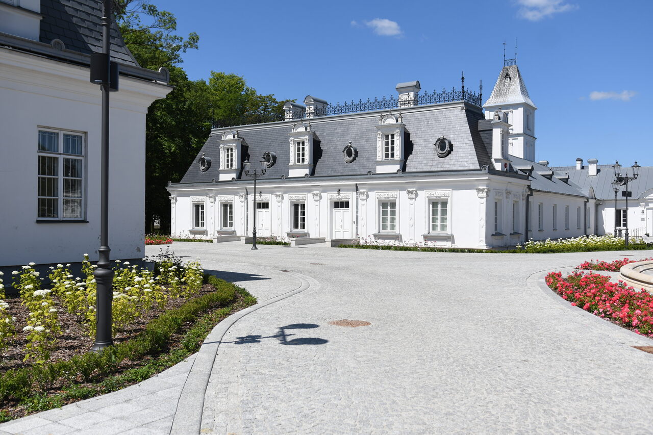W 2024 roku przeprowadzono kompleksową rewitalizację Zespołu Pałacowo-Parkowego. Projekt rewaloryzacji dziedzińca oparto na układzie geometryczno-płaszczyznowym, z zachowaniem osiowego i symetrycznego charakteru dziedzińca honorowego oraz drogi dojazdowej. Głównym celem inwestycji było uporządkowanie istniejącego stanu zagospodarowania oraz poprawa walorów estetycznych i przestrzennych zespołu pałacowo-parkowego, z poszanowaniem jego historycznego charakteru. Zakres prac objął wykonanie nowej nawierzchni dróg i chodników. Przebudowano instalacje: elektroenergetyczną, wodociągowo-kanalizacyjną i teletechniczną. Przeprowadzono konserwację zachowanych elementów zabytkowych: rzeźb, kolumn, fontanny, fragmentu ogrodzenia oraz bramy głównej. Zgodnie z założeniami projektowymi podkreślono historyczną formę architektoniczną w stylu renesansu francuskiego, nadaną zespołowi na przełomie XIX i XX wieku. Odtworzono szpalery drzew wzdłuż drogi dojazdowej oraz uzupełniono nasadzenia drzew w układzie podwójnie symetrycznym przy fontannie. Zachowano istniejące głogi rosnące przed budynkiem pałacu. Wprowadzono symetryczne rabaty z krzewów róż i hortensji, ujęte w formie żywopłotów obwódkowych. Teren wyposażono w stylizowane oświetlenie, elementy małej architektury, system nagłośnieniowy oraz monitoring.