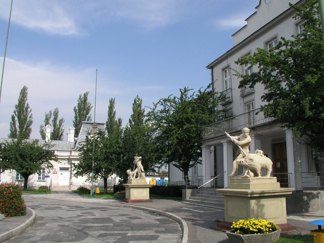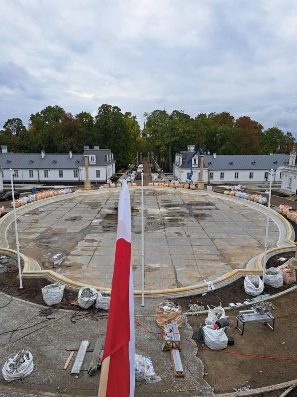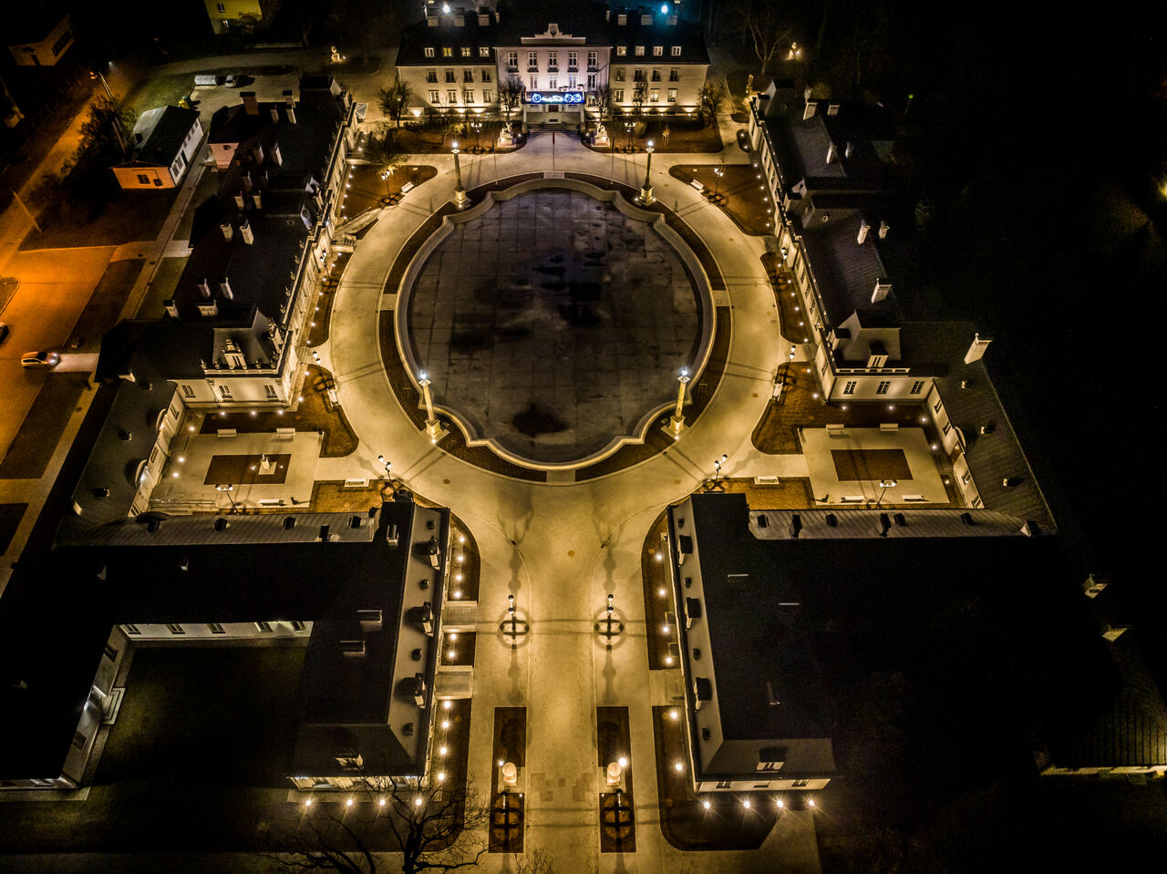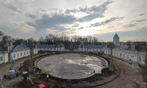 W 2024 roku przeprowadzono kompleksową rewitalizację Zespołu Pałacowo-Parkowego. Projekt rewaloryzacji dziedzińca oparto na układzie geometryczno-płaszczyznowym, z zachowaniem osiowego i symetrycznego charakteru dziedzińca honorowego oraz drogi dojazdowej. Głównym celem inwestycji było uporządkowanie istniejącego stanu zagospodarowania oraz poprawa walorów estetycznych i przestrzennych zespołu pałacowo-parkowego, z poszanowaniem jego historycznego charakteru. Zakres prac objął wykonanie nowej nawierzchni dróg i chodników. Przebudowano instalacje: elektroenergetyczną, wodociągowo-kanalizacyjną i teletechniczną. Przeprowadzono konserwację zachowanych elementów zabytkowych: rzeźb, kolumn, fontanny, fragmentu ogrodzenia oraz bramy głównej. Zgodnie z założeniami projektowymi podkreślono historyczną formę architektoniczną w stylu renesansu francuskiego, nadaną zespołowi na przełomie XIX i XX wieku. Odtworzono szpalery drzew wzdłuż drogi dojazdowej oraz uzupełniono nasadzenia drzew w układzie podwójnie symetrycznym przy fontannie. Zachowano istniejące głogi rosnące przed budynkiem pałacu. Wprowadzono symetryczne rabaty z krzewów róż i hortensji, ujęte w formie żywopłotów obwódkowych. Teren wyposażono w stylizowane oświetlenie, elementy małej architektury, system nagłośnieniowy oraz monitoring.