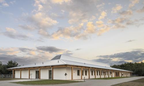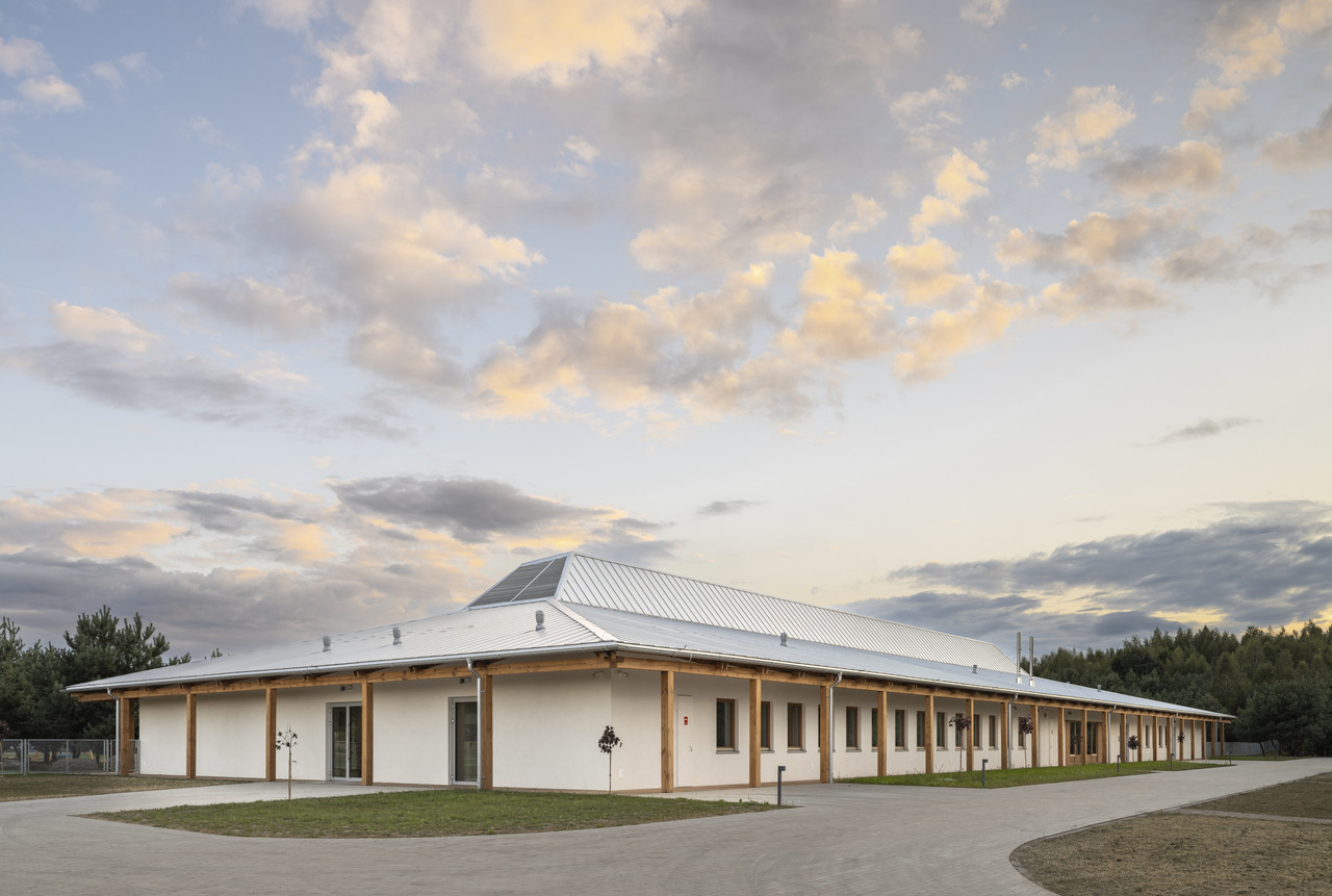 Nowy budynek Przedszkola i Żłobka w Kosowie Lackim powstał jako obiekt parterowy, harmonijnie wpisany w zielone, częściowo leśne otoczenie. Jego forma jest prosta i spokojna, oparta na naturalnych proporcjach oraz jasnych, uporządkowanych liniach. W wykończeniu zastosowano naturalne materiały, w szczególności drewno i elementy o drewnianej fakturze, które podkreślają bliski związek obiektu z przyrodą i nadają mu ciepły, przyjazny charakter. Duże przeszklenia zapewniają wnętrzom dostęp do światła dziennego i stały kontakt z zielenią. Budynek nie dominuje nad otoczeniem, lecz współgra z nim, tworząc spokojne i bezpieczne miejsce dla najmłodszych.