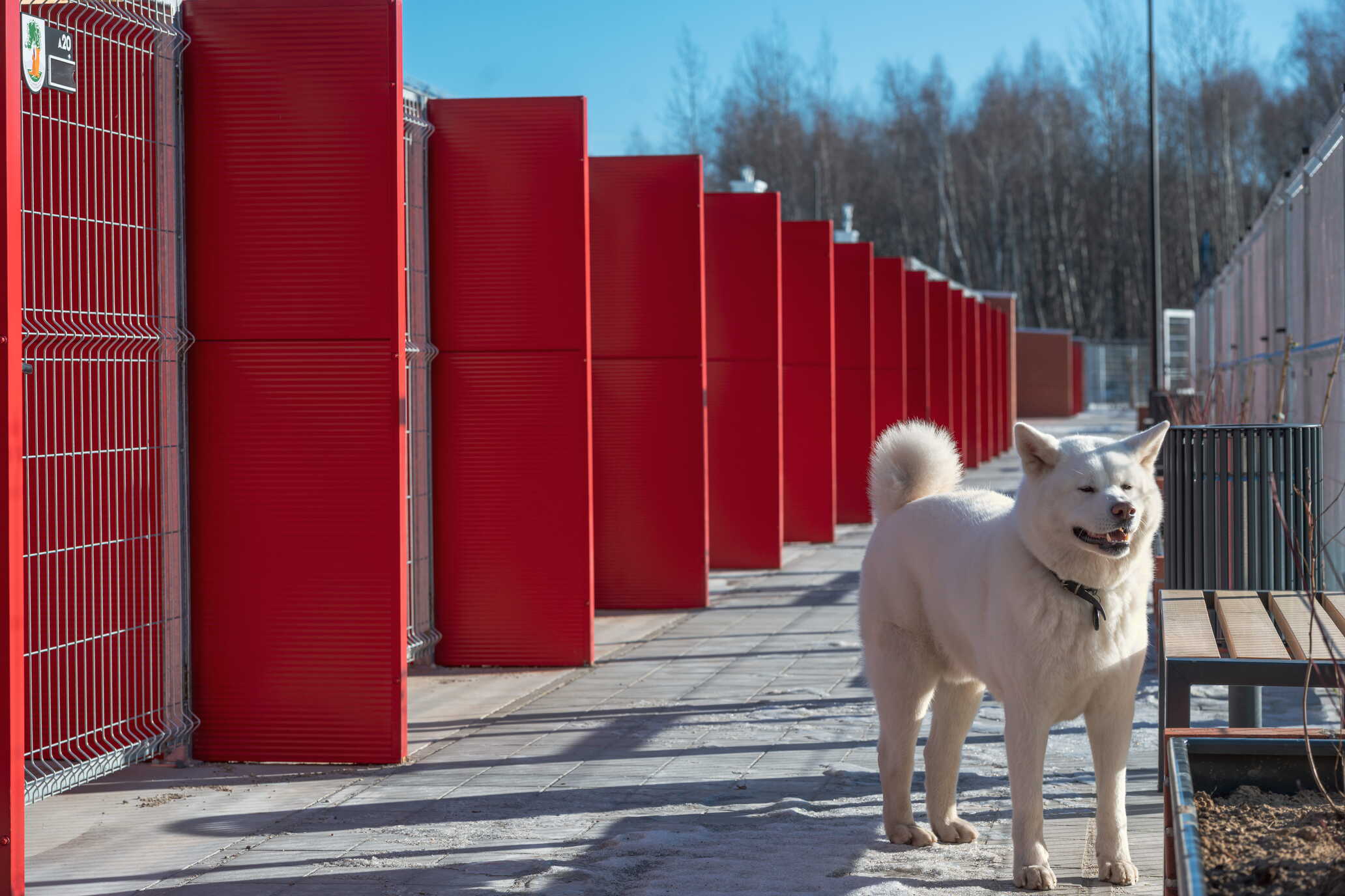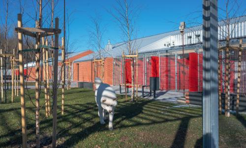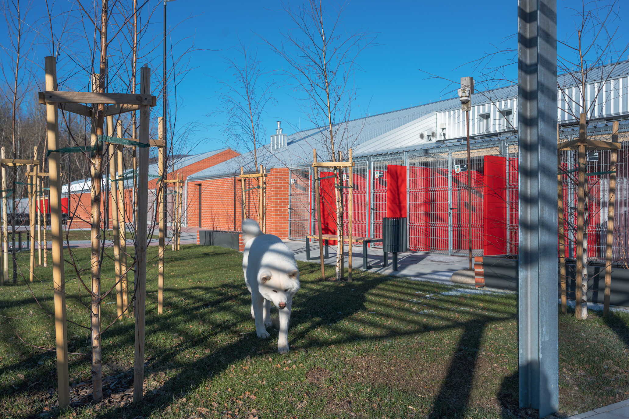 Integralnym elementem założenia jest zagospodarowany dziedziniec pomiędzy pawilonami – przestrzeń wspólna, przeznaczona zarówno dla zwierząt, jak i ich opiekunów. Zaprojektowano alejki, nasadzenia drzew oraz podstawowe elementy małej architektury. Całość porządkuje pergola okalająca dziedziniec, tworząca czytelną ramę dla codziennego użytkowania.