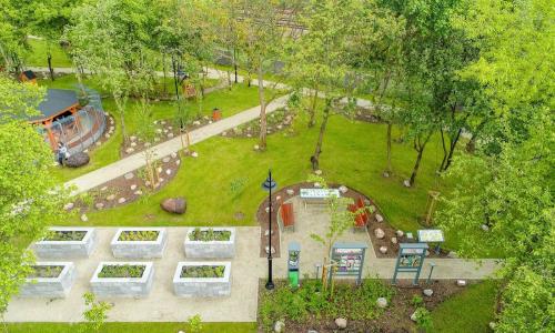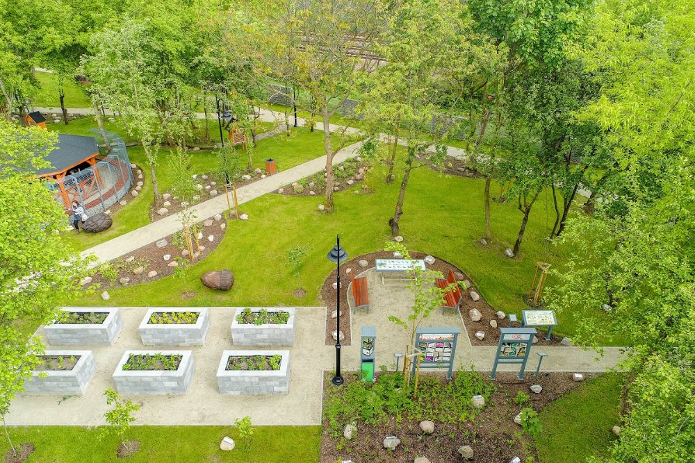 Zagospodarowanie terenu stworzyło możliwie bogate, wielopiętrowe i wielogatunkowe założenie zieleni oparte na gatunkach rodzimych, tworzące dogodne warunki dla rodzimych ptaków, owadów i drobnych ssaków. To unikatowe na skalę regionu miejsce, swoista enklawa, bezpieczna i atrakcyjnie urządzona przestrzeń do rekreacji, edukacji, zabawy i odpoczynku.