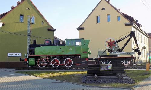 Historyczny tabor kolejowy tj. Lokomotywa parowa TKh 2942 typ T3A| Ferrum 47, r.prod.1951 oraz ręczny żuraw kolejowy typ DRP, r.prod.1908r. Postawiony na skwerze ulic Sikorskiego i Partyzantów w Węglińcu