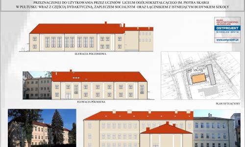 Budowa hali gimnastycznej, przeznaczonej do użytkowania dla uczniów Liceum Ogólnokształcącego im. Piotra Skargi w Pułtusku z 1440 roku wraz z niezbędnym łącznikiem (połączeniem) z istniejącym budynkiem szkoły wraz z częścią dydaktyczną i zapleczem socjalnym. Inwestycja obejmowała również wykonanie ogrodzenia oraz zewnętrznych urządzeń sportowych, parkingów oraz towarzyszącej infrastruktury technicznej. Inwestycja znajduje się na obszarze objętym formami ochrony zabytków, o których mowa w art. 7 ustawy z dnia 23 lipca 2003r. o ochronie zabytków i opiece nad zabytkami (Dz.U.z2014r., poz. 1446 z późn. zm.) oraz ujętych w gminnej ewidencji zabytków: - Liceum Ogólnokształcące im. Piotra Skargi (dawn. Kolegium Jezuickie) – wpis do Gminnej Ewidencji Zabytków; - zespół urbanistyczno-architektoniczny miasta – wpis do rej. zabytków (Nr A-82 z 18.11.1959r.) oraz Gminnej Ewidencji Zabytków; - otoczenie baszty obronnej (100m) - wpis do rej. zabytków (Nr A-80 z 06.08.1959r.) oraz gminnej ewidencji zabytków.