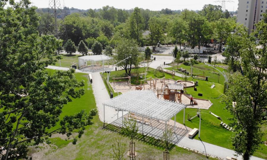 to przestrzeń biologicznie czynna - przeważa tam zieleń, w której mogą zamieszkać owady i małe zwierzęta. Ptaki, poza wybudowanymi budkami lęgowymi, znajdą miejsce gniazdowania w otulinach krzewów, a dla biedronek, motyli i innych owadów architekci przewidzieli ochronne domki. Łąki kwietne latem ozdobią park, a także będą pokarmem dla pszczół i trzmieli. Ogrodnicy będą kosić trawniki tylko pięć razy w roku, a łąkę kwietną jedynie raz. Dzięki temu park zachowa swój naturalny charakter.
