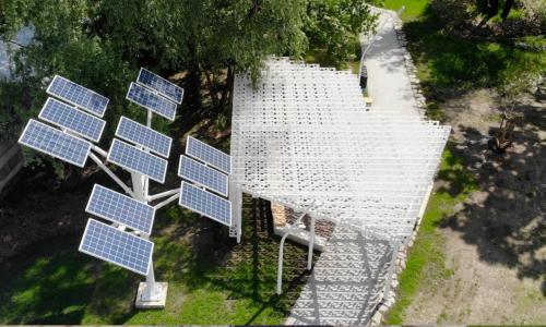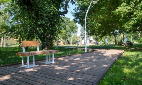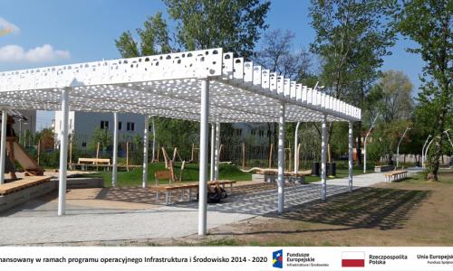 z recyklingu. Znajdziemy tu wiele proekologicznych rozwiązań, np. latarnie zasilane energią odnawialną z ogniw fotowoltaicznych, system niecek bioretencyjnych odbierających i gromadzących wodę opadową z terenu parku, czy też nawierzchnie ciągów komunikacyjnych, gdzie wykorzystano materiały mineralne przepuszczające wodę.