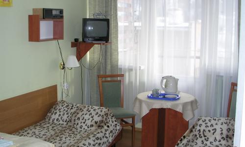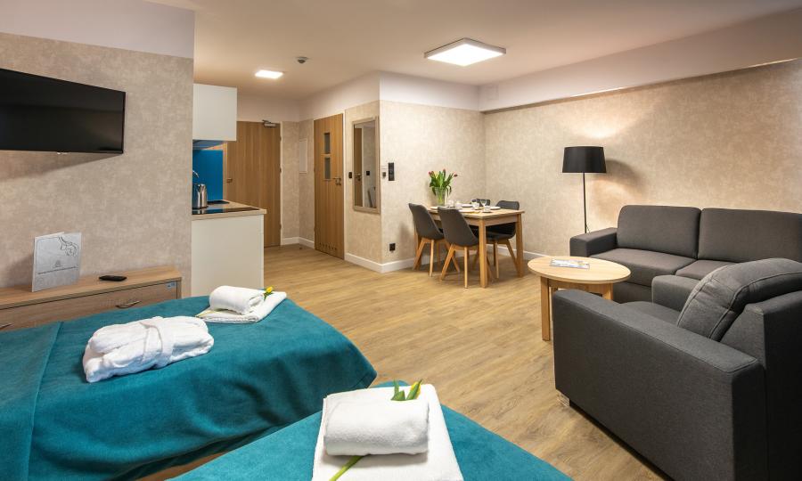 Pokoje apartamentowe z aneksem kuchennym – 6 pokoi – jest to rozwiązanie w którym adaptacja dotychczasowych pokoi 2 osobowych pozwoliła na stworzenie pokoi z nowoczesną sypialnią z łóżkiem małżeńskim i kanapą, która może służyć jako łóżko dla dwóch osób