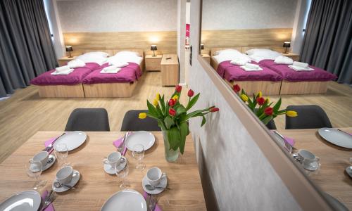 Apartament dwupokojowy z aneksem kuchennym – 4 pokoje – jest to rozwiązanie w którym adaptacja dotychczasowych pokoi 2 osobowych pozwoliła stworzenie przestrzennych, bardzo wygodnych apartamentów rodzinnych składających się z dwóch pokoi dwuosobowych i holu z aneksem kuchennym