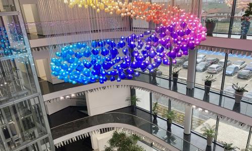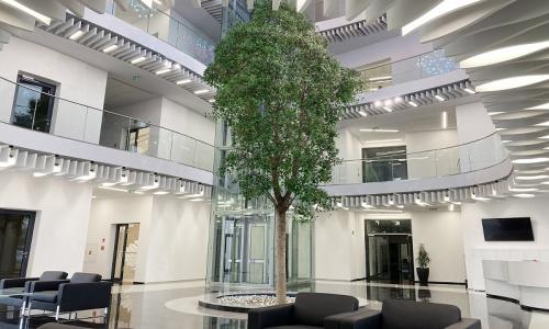 Wewnątrz hallu wejściowego wykonano antresole (na trzech poziomach), tworzące otwartą przestrzeń, którą wypełniają żywe drzewo oraz indywidualnie zaprojektowany i wykonany żyrandol, składający się z 664 kostek oświetleniowych z ręcznie dmuchanego i barwionego szkła. Kolorystyka żyrandola nawiązuje do palety barw stosowanej w poligrafii (tzw. CMYK). Wewnątrz hallu zaprojektowano również dwie oszklone windy łączące poszczególne kondygnacje budynku. Łączna powierzchnia użytkowa biurowca jest równa 8042 m2. Do obiektu przylega hala produkcyjna o powierzchni 1879 m2. Główne wejście usytuowano na skraju obiektu, aby zapewnić możliwość dalszej rozbudowy w przyszłości, kontynuując rozpoczęte linie łuków.