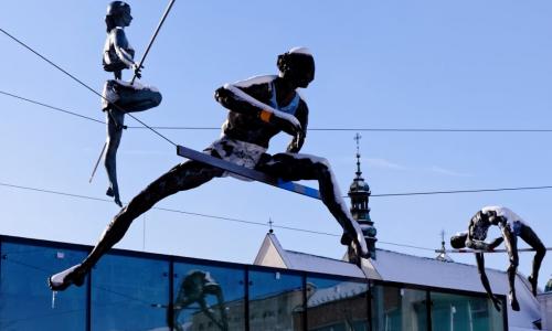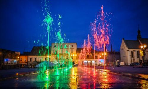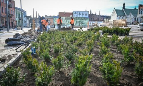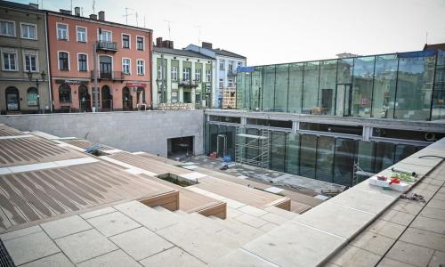 - prace związane z zagospodarowaniem terenu i przebudową płyty rynku. Zabudowa powierzchni placu w fontannę w postaci pasa wodnego, schodów prowadzących do części podziemnej o amfiteatralnym charakterze z siedziskami wykończonymi drewnem i nasadzeniem zielenią, oświetleniem, odwodnieniem terenu, montażem słupów dla rzeźb balansujących i elementami małej architektury:
