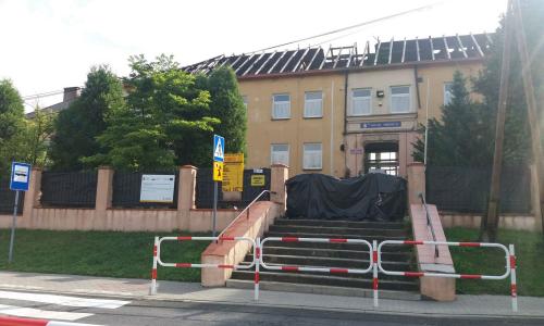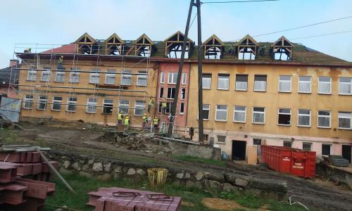 - przebudowę dachu szkoły polegający na wymianie istniejącego pokrycia z blachy na dachówkę, wymianę rynien i rur spustowych, obróbek blacharskich, wykonaniu doświetlenia projektowanych pomieszczeń,