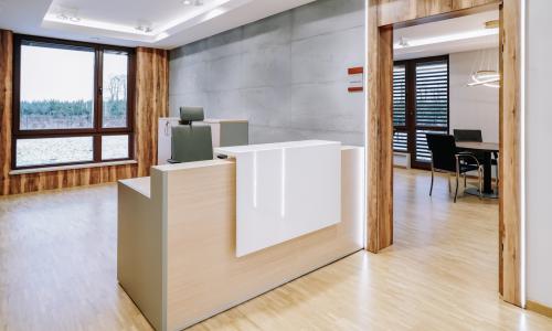 Budynek stanowi bryłę złożoną z prostopadłościanów. Jest obiektem wolnostojącym niepodpiwniczonym posiadający dwie kondygnacje, a w części jedną kondygnację nadziemną. W części dwukondygnacyjnej znajduje się główna część pomieszczeń biurowych i pomocniczych, a w części jednokondygnacyjnej sala konferencyjna. Na podłogi we wszystkich pomieszczeniach biurowych i komunikacji zastosowano parkiet przemysłowy. Do budowy elementów konstrukcyjnych i wykończenia zużyto prawie 300 m3 drewna.