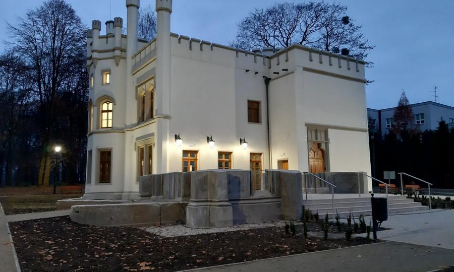 W styczniu 2019 r. rozpoczęły się prace budowlano–terenowe mające na celu uratowanie znajdujących się w stanie katastrofalnym ruin skrzydła pałacu. W trakcie prac zakończonych w grudniu 2020 r. odsłonięto również znajdujące się pod gruzami fragmenty murów pałacu wraz z kaplicą i elementami neogotyckiego detalu obrazujące skalę pierwotnego założenia. Ruina oraz reliktowo zachowane detale architektoniczne, stolarka okienna, ceglane sklepienia, ceramiczne posadzki stały się podstawą projektu elewacji i inspiracją do aranżacji wnętrza obiektu, który będzie odtąd służyć lokalnej społeczności swoją nową kulturalną funkcją jednocześnie przypominając o bogatej historii miejsca i regionu.