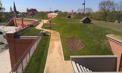 11. Na podstawie dokumentacji z 1888 r. odtworzono nasyp przykrywający obiekt wraz z ziemnymi działobitniami, poprzecznicami i drogą wałową.