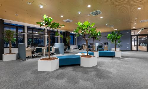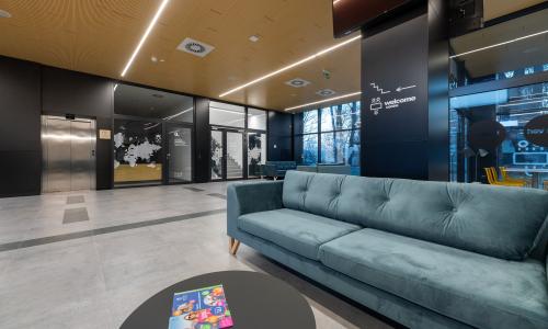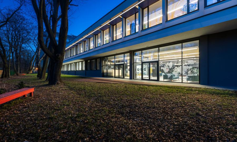 Istniejący przejazd pod budynkiem zabudowano przeszkleniami, które stworzyły duży, przyjazny hol wraz z kawiarnią i otwarciem na teren zielony. Wprowadzono do wnętrz naturalne materiały wykończeniowe, drzewa w donicach podkreślające sąsiedztwo parku i terenów zielonych.