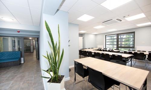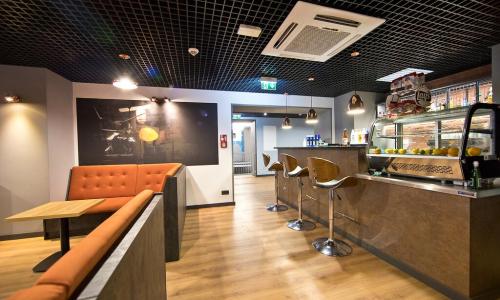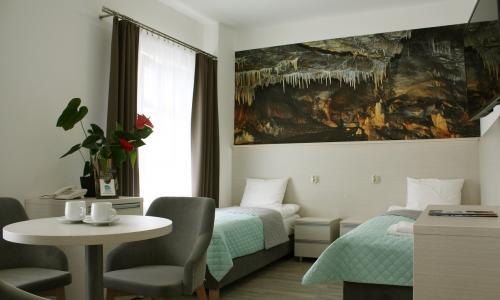 Na poziomie piwnicy, zamieniono pomieszczenia piwniczne na część rozrywkową, mini-kręgielnię, pub z salką tv/bilardową, pomieszczenia techniczne i bloki sanitarne; na poziomie parteru przebudowano sale lekcyjne na salę restauracyjną z zapleczem gastronomicznym i szkoleniowym. W hotelu część gastronomiczna została zaprojektowana w sposób umożliwiający prowadzenia nauki zawodu grupach 10 osobowy. Natomiast na poziomach I, II, i III piętra przebudowano sale lekcyjne na pokoje hotelowe. Nad aranżacją wnętrz hotelu pracowała Pani Architekt Beata Lukas z Pracowni Lukas Art - projektowanie wnętrz.