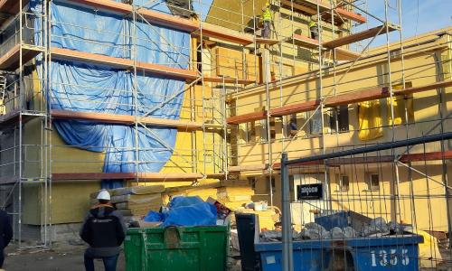 Ocieplenie ścian zewnętrznych z uwzględnieniem zatwierdzonej płytki elewacyjnej przez Konserwatora Zabytków stanowiącej odwzorowanie cegły silikatowej.