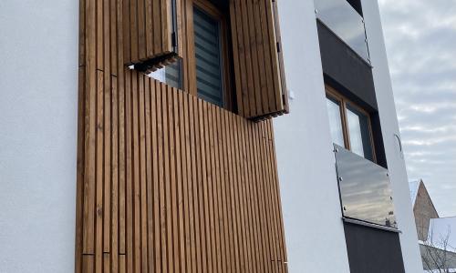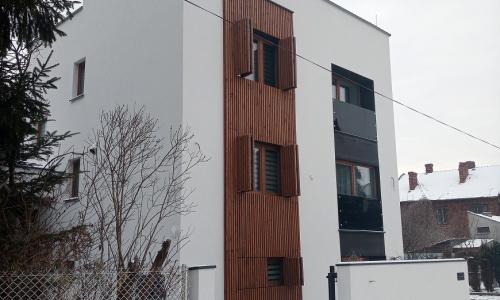 Biała elewacja zewnętrzna została przełamana i ocieplona - deską elewacyjną w połączeniu z okiennicami drewnianymi harmonijkowymi DeLux . Całość tworzy spójną całość i nadaje domowi oryginalny i niepowtarzalny wygląd.