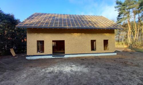 Budowa budynku mieszkalnego jednorodzinnego z częścią biurową dwukondygnacyjnego o konstrukcji szkieletowej z elementów drewnianych litych oraz klejonych wzdłużnie, niepodpiwniczony z dachem dwuspadowym posadowionym na płycie fundamentowej.