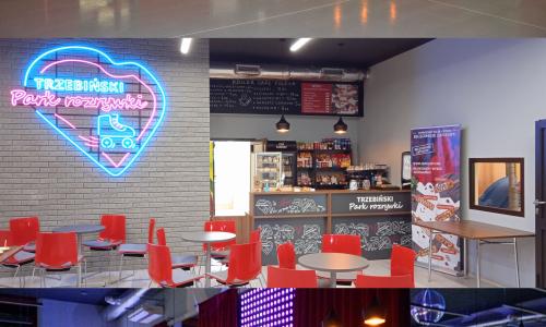 b) zmianę sposobu użytkowania części pomieszczeń zlokalizowanych na parterze na centrum rozrywki w skład którego wchodzi wrotowisko z możliwością wykorzystania go jako sali koncertowej i sali do innych zajęć, wypożyczalnia wrotek, bawialnia dla dzieci wraz z wewnętrznym placem zabaw oraz kawiarnią,