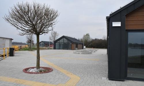- 4 budynki przeznaczone pod usługi gastronomiczne wraz z niezbędnym zapleczem, oświetlonymi chodnikami i placami utwardzonymi z kostki brukowej wyposażonymi w elementy małej architektury: stojaki rowerowe, ławki (parkowe, piknikowe, pierścieniowe z modemem USB do ładowania),