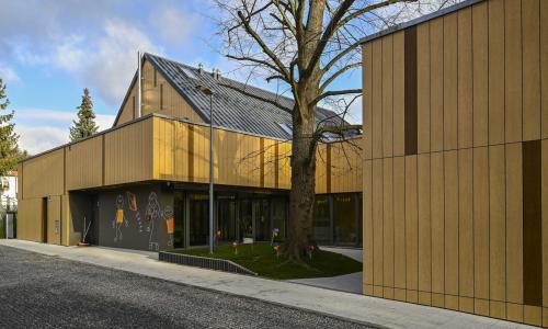 Budynek nowego żłobka został zaprojektowany na 60 miejsc opieki nad dziećmi do lat 3, jako wolnostojący obiekt wkomponowany w otaczającą go zieleń i zabytkowy budynek przedszkola w sąsiedztwie. Będące pod ochroną konserwatorską duże zadrzewienie oraz pofałdowanie terenu budowy dały doskonały efekt architektoniczny, jaką jest ciekawa bryła obiektu.