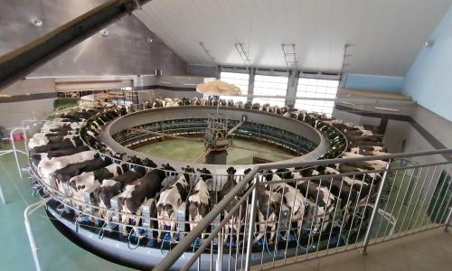 Krowy przechodzą dwa razy dziennie do udojni wyposażonej w dojalnię karuzelową firmy Fullwood na 60 stanowisk z obsługą zewnętrzną i obracającą się przeciwnie do wskazówek zegara.