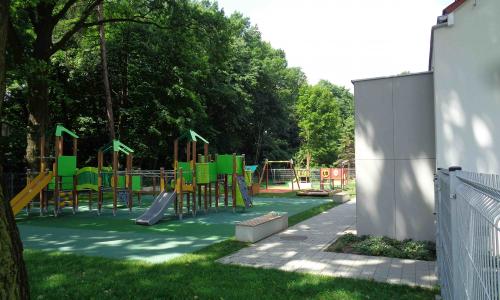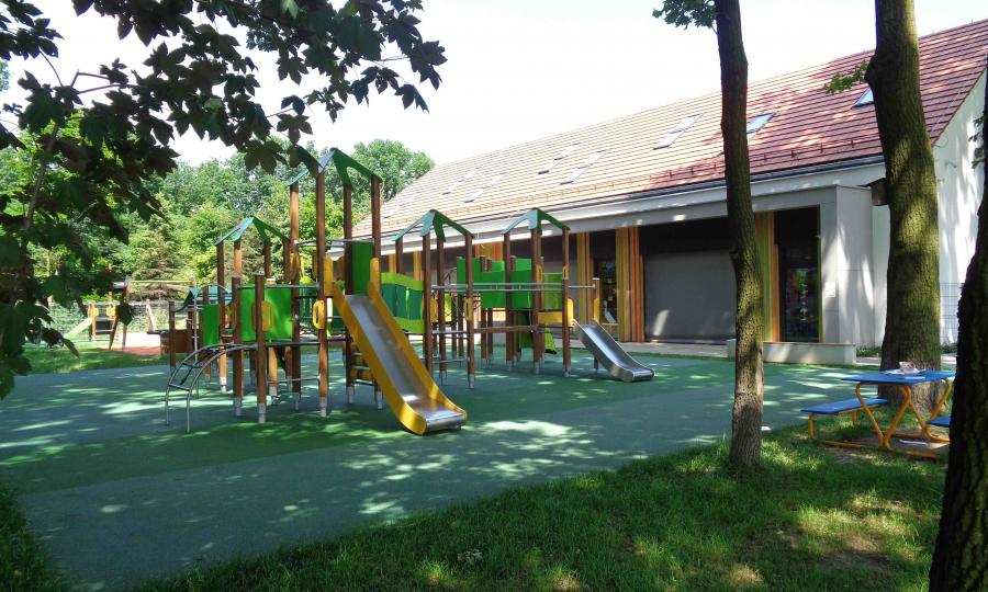 Budynek zlokalizowano na działce nr 654/114 stanowiącej część zespołu działek wyznaczonych w MPZP pod usługi publiczne. Budynek zaprojektowano w formie dwóch lekko obróconych względem siebie, wyższych brył o dwuspadowych dachach połączonych łącznikiem o dachu płaskim. Układ budynków na działce oraz lokalizacja przeszkleń skutkuje korzystnym nasłonecznieniem sal dzieci oraz pozwala jednocześnie na pasywne zyski ciepła z promieniowania słonecznego.