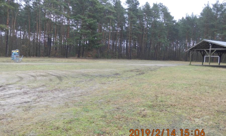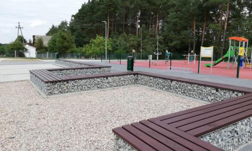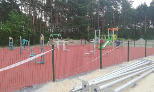 - plac zabaw z następującymi urządzeniami zabawowymi i siłowymi: 2 ławki z oparciem, podwójna huśtawka z siedziskiem typu deseczka dla dzieci większych oraz bezpiecznym siedziskiem dla dzieci mniejszych, huśtawka wagowa, zestaw z m.in.: zjeżdżalnią, ścianką wspinaczkową, linarium;, urządzenia siłowni zewnętrznej typu: twister potrójny, wahadło podwójne; kosz na śmieci; tablica z regulaminem placu; ogrodzeniem z siatki oraz bezpieczną nawierzchnią z EPDM;