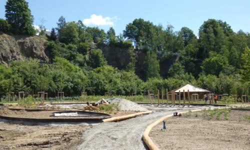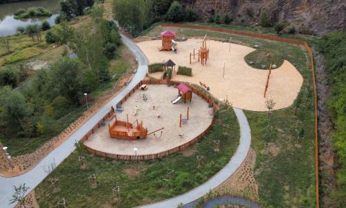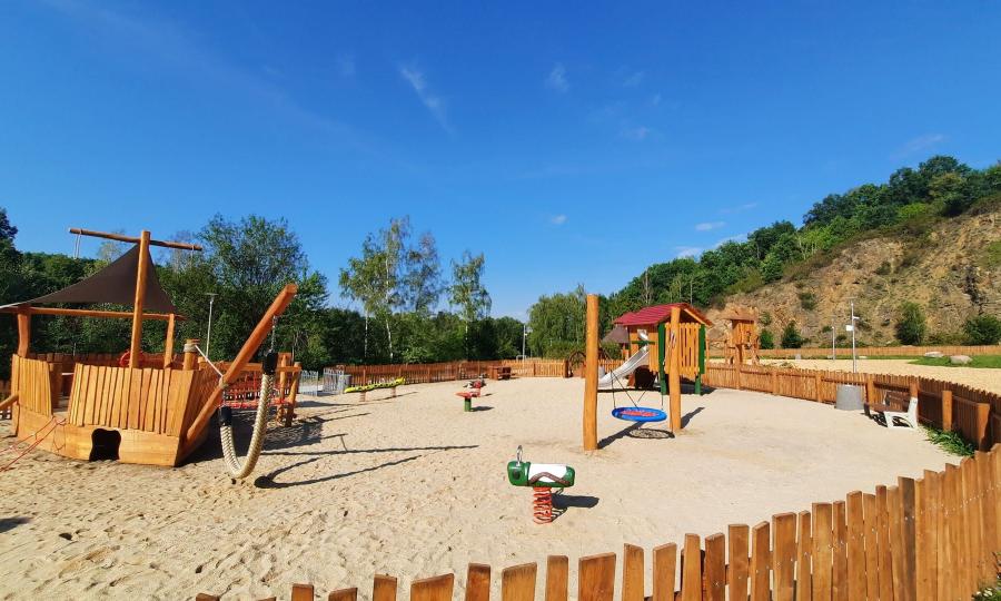Nowy plac zabaw nad zalewem Czerwona Woda w Zgorzelcu powstał w miejscu, które niezbyt zachęcało do spędzania czasu na wolnym powietrzu - kilka wysłużonych sprzętów i dzikie zarośla nie przekonywały ani najmłodszych, ani ich opiekunów. Autor projektu stworzył plac zabaw w stylu Natural Play wykorzystując naturalne elementy otoczenia takie, jak drewno, roślinność, kamień (tutaj też i głazy) oraz naturalne ukształtowanie terenu – pagórki, czy zagłębienia. Całość została podzielona na strefy dla dzieci małych (0-6 lat) oraz dla dzieci większych i młodzieży (7-16 lat). Nowy plac zabaw ma nie tylko zapewnić dzieciom bezpieczną zabawę, ale też wspomagać ich rozwój sensoryczny i psychoruchowy, dostarczając bodźców dotykowych i okazji do ćwiczenia zmysłu równowagi, wzmacniania mięśni, szybkości i gibkości. Budowa placu zabaw jest kolejnym etapem projektu „Przygoda z Nysą – zagospodarowanie turystyczne pogranicza polsko-niemieckiego - etap V”, w ramach którego wcześniej, na przyległym terenie powstały już blisko 2km ścieżek o nawierzchniach asfaltowej, naturalnej gruntowej i utwardzonej kostką kamienną, mostki i stacje z urządzeniami do ćwiczeń. Całość tworzy dużą, wkomponowaną w naturalne otoczenie pętlę, która otacza między innymi nowo powstały plac zabaw. Miejsce to idealnie nadaje się do zabawy, rekreacji i wypoczynku.