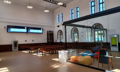 Przestrzeń obsługi podróżnych mieści się na parterze w zachodniej części budynku w dawnej poczekalni 3. i 4. klasy. Podróżni znajdą tam przestronną, jasną poczekalnię z oświetleniem nawiązującym do historycznego charakteru dworca. Wyposażono ją w ławki, gabloty na rozkłady jazdy oraz elektroniczne tablice przyjazdów i odjazdów pociągów. Nowością jest również specjalna strefa dziecka, znajdująca się za szklaną witryną. W przestrzeni obsługi podróżnych nie zabraknie toalet oraz niewielkiego lokalu na wynajem. Równie ciekawie prezentuje się wschodnia część budynku. W dawnej poczekalni 1. i 2. klasy zlokalizowano kameralną salę kinową oraz powierzchnię wystawienniczą. Mieści się tam również posterunek Straży Ochrony Kolei.