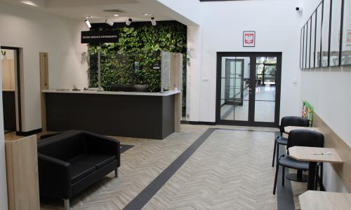 Przy wejściu głównym do budynku usytuowano pomieszczenia z których najczęściej korzystają klienci a więc biuro podawcze, kasę, pokój podatków i opłat lokalnych, pokój USC oraz windę. Recepcja - biuro podawcze - zlokalizowana w hollu budynku jest otwarta i zwrócona w stronę głównego wejścia. W recepcji znajduje się ogród wertykalny, który zdecydowanie ożywia wnętrze i nadaje mu bardziej organiczny charakter.
