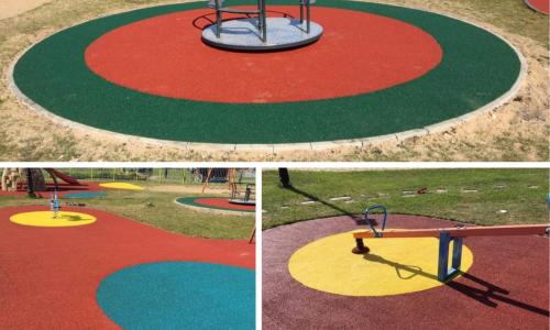 Na terenie placu zabaw pod karuzele tarczową z siedziskami zamontowana została nawierzchnia poliuretanowa dwuwartstwowa SBR i EPDM