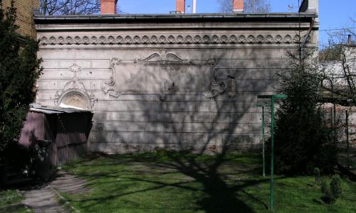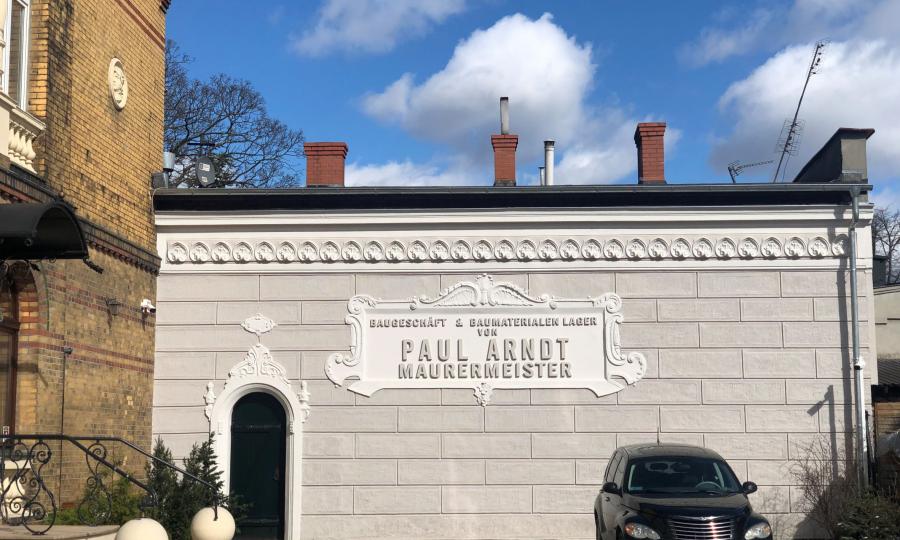 Przybudówka została wybudowana w 1903 r. w stylu neorenesansowym. Pierwotnie przeznaczona była na przechowywanie wozów i bryczek. Na jej głównej ścianie od strony ulicy znajdował się ozdobny kartusz z nieczytelnym napisem w środku. W roku 2008 chojnicki regionalista p. Andrzej Rolbiecki, rozszyfrował teks zapisany w języku niemieckim. W tłumaczeniu: "Sklep budowlany i magazyn materiałów budowlanych , prowadzony przez Paul Arndt, Mistrz Murarski", który został odtworzony. Elementy dekoracyjne zostały poddane konserwacji natomiast nieistniejące fragmenty odtworzone. Nad całością prac nadzór pełniła Marlena Pawlak - Konserwator Zabytków Miasta Chojnice. Obiekt otrzymał dofinasowanie od Urzędu Miejskiego w Chojnicach w kwocie 33 550,00 zł.