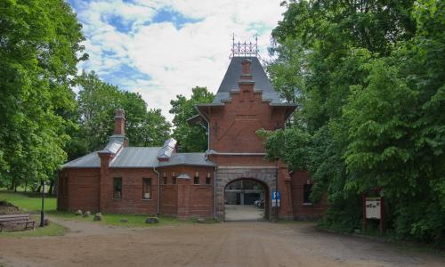 Brama jest częścią pałacu wzniesionego w latach 1889-1894 na polecenie Aleksandra III. Mieściła się w niej wartownia i zbrojownia, z której korzystał car podczas polowań w Puszczy Białowieskiej. Sam pałac Niemcy zniszczyli pod koniec II wojny światowej. Zachowała się tylko brama z przyłączonymi do niej trzema aneksami. Do tej pory pomieszczenia były wykorzystane na potrzeby parku. Po renowacji mają być tam wystawy prezentujące historię Białowieży z czasów carskich.