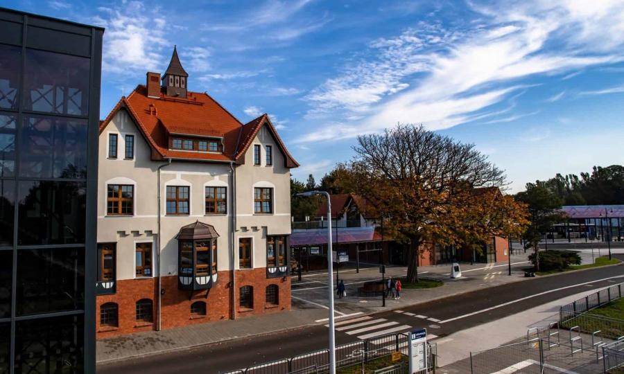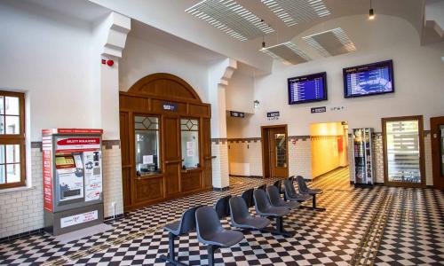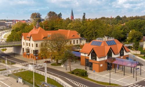 Został kompleksowo wyremontowany zabytkowy budynek dworca kolejowego, wpisany do wojewódzkiej ewidencji zabytków. Przywrócono mu historyczny charakter, na dach powróciła charakterystyczna wieżyczka, a przy wejściu zawisł zegar dworcowy. Przekryta wielospadowym dachem bryła usytuowana na nasypie (połączono w ten sposób poziom torów z poziomem wiaduktu), stanowiła wyjątkowo trudne wyzwanie dla modernizacji. W ramach modernizacji w budynku zlokalizowano oprócz poczekalni, przechowalni bagażu, kas, informacji turystycznej, toalet ogólnodostępnych, pomieszczeń biurowych i technicznych, również wypożyczalnię rowerów oraz pomieszczenia biurowe i lokal usługowy przeznaczone na potrzeby Centrum Wsparcia Mieszkańców Obszaru Rewitalizacji. Obiekt dworca kolejowego uzyskał certyfikat na zgodność z wymaganiami Rozporządzenia Komisji (UE) NR 1300/2014 z dn. 18.11.2014 r. w sprawie technicznych specyfikacji interoperacyjności odnoszących się do dostępności systemu kolei Unii dla osób niepełnosprawnych i osób o ograniczonej możliwości poruszania się (TSI PRM).