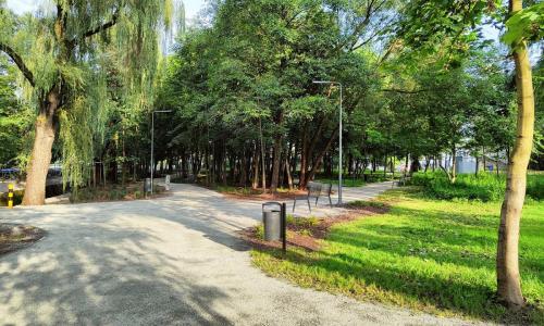 Obszar wypełniają kwatery nasadzeń w formie przyjaznych owadom łąk kwietnych oraz grup krzewów – głownie jeżyn i berberysu, a także szpalery drzew, pomiędzy którymi wytyczono żwirowe alejki. Mur oporowy przy strefie brzegowej rzeki Białej i Straconki zabezpieczony został balustradą Obszar wyposażono w obiekty małej architektury tj. ławki, stojaki na rowery, kosze na odpadki oraz umiejscowiono kontenerową toaletę miejską. Na całym trenie wykonano oświetlenie parkowe a także zlokalizowano tablice edukacyjne, lokalizacyjne i gatunkowe, wskazujące cenne gatunki drzew. Ponadto umiejscowiono dodatkowe elementy podnoszące wartość ekologiczną terenu w formie domków dla owadów oraz budek dla ptaków i nietoperzy.