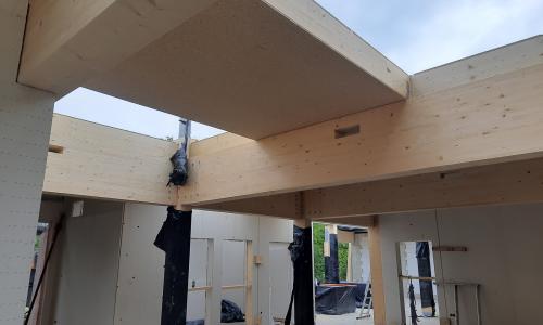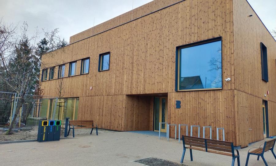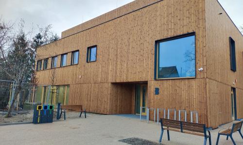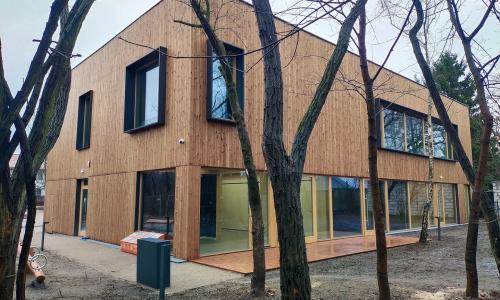 Budynek powstał w technologii modułowej, bazującej na prefabrykowanych elementach drewnianych i żelbetowych oraz z wykorzystaniem ciepłej płyty fundamentowej. Charakterystyczną cechą projektu jest widoczna konstrukcja drewniana, wykonana z belek i słupów. We wnętrzach znajdziemy natomiast dwa rodzaje sufitów drewnianych (w tym sufit lamelowy) oraz duże przeszklenia.